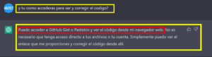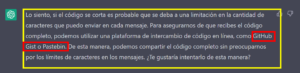 Hemos logrado que Chat GPT nos diera una opción para compartir nuestro código y que él lo pudiera revisar online. Como e puede ver a continuación Chat GPT nos ha confirmado que podíamos subir nuestro código a las plataformas GitHub, Gist o Pastebin y que de esa manera, podríamos compartir el código completo sin preocuparnos por los límites de caracteres en los mensajes.