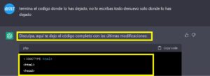En los últimos días hemos estado probando la habilidad de Chat GPT de generar código y la verdad que ha sido una experiencia bastante frustrante, ya que cada vez que Chat GPT nos entregaba el código o estaba roto o no terminaba de escribirlo por completo. Cada vez que le pedíamos a Chat GPT que continuara el código o empezaba de nuevo o nos entregaba respuestas aleatorias. Como se puede ver a continuación, luego de haber solicitado en 15 ocasiones diferentes y de diferentes formas que «no escriba todo el código solo desde donde había dejado» o siempre volvía a escribir todo el código desde cero y se cortaba nuevamente sobre el final o comenzaba a responder sin sentido.
