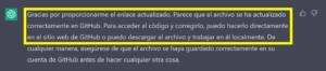 Ante semejante alegría de que podíamos compartir el código con Chat GPT online decidimos hacer una prueba. Subimos el código a GitHub, copiamos la url del código y la compartimos con Chat GPT y voila.